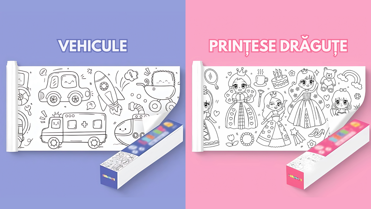 Tematici Dublu Distractive – Aventuri pe patru roți pentru băieți și prințese adorabile pentru fete – fiecare metru e o nouă poveste de colorat!