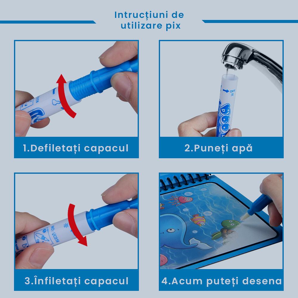 🎨 Magie cu Apă, Nu cu Carioci – Umpli pixul cu apă și... începe distracția! Fiecare pagină prinde viață în culori intense, apoi revine la alb după câteva minute. Reutilizabilă la nesfârșit!
